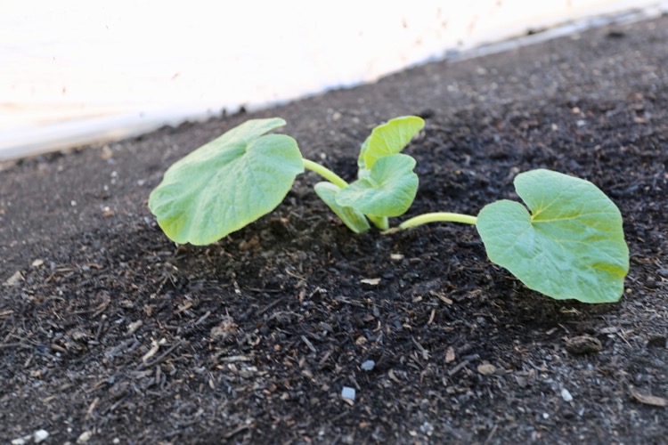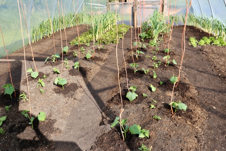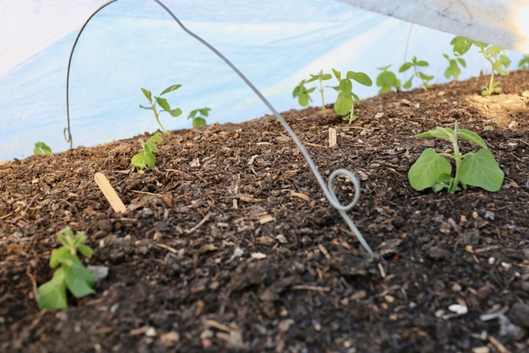 View West side May 13th and new planting of Kuri squash is under the fleece, beans 5th year consecutive same beds