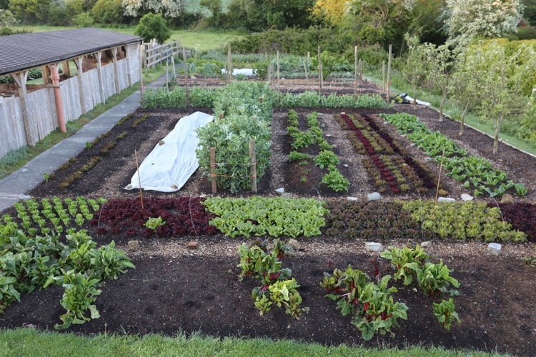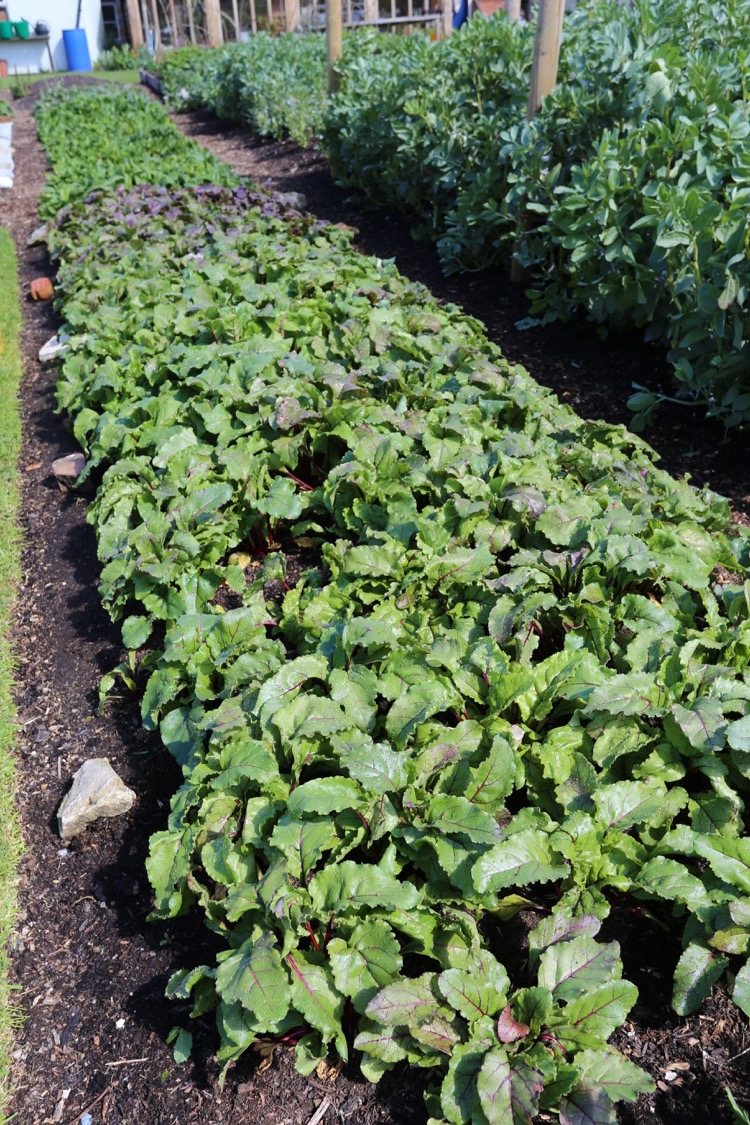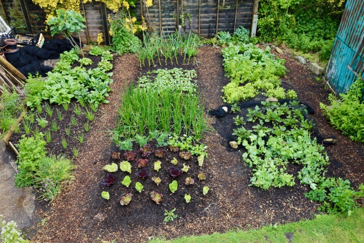 Small garden mid May, still winter salads on far right, overwintered spinach & spring onions