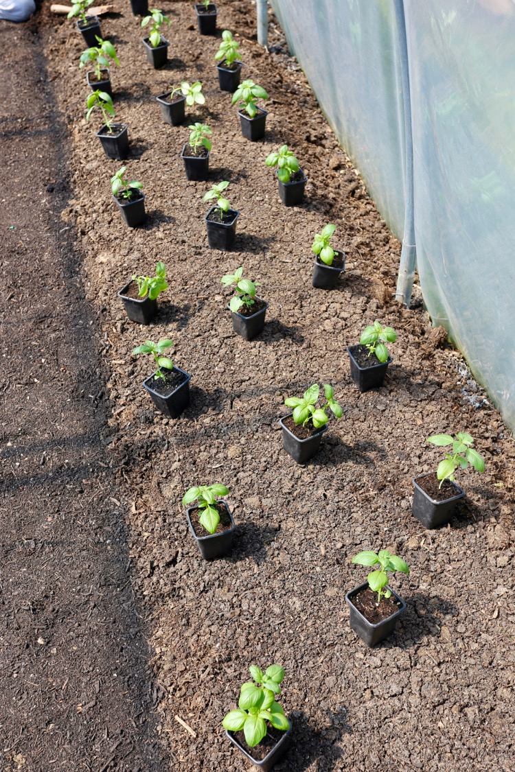 Basil sown 39 days ago in modules, potted on, now planting under cover