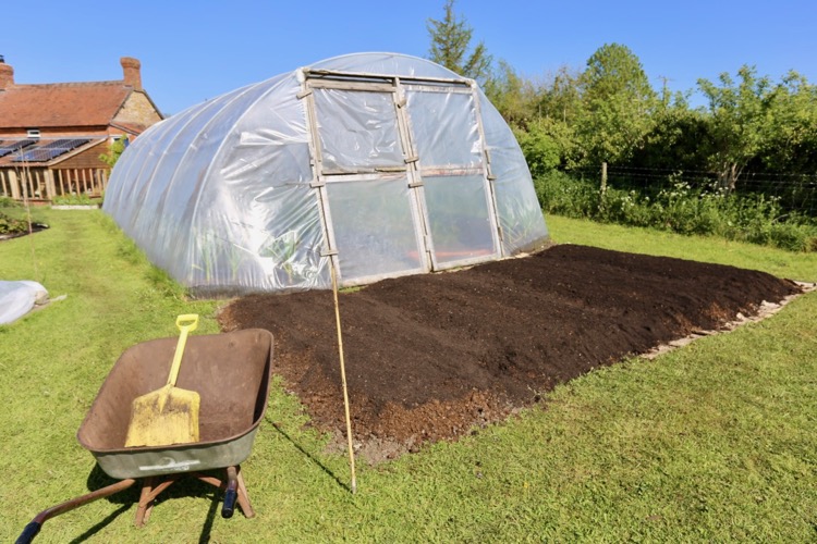 The new tunnel is 10ft or 3m longer, so we mulched the ground for planting very soon