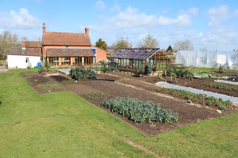 This is where I have three strips of 2m (6.5 feet) width and 9m (29 feet) long. The nearest one is dug, the other two are undug. The nearest and second strip have municipal compost on top which has food waste added, the third strip has composted cow manure on top, 5xm (2in) per year. Each strip is divided into six beds of 1.2m (4 feet) width.