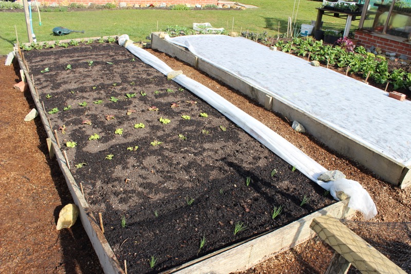 Using fleece, tips on sowing and planting in dry conditions, spring salad harvest, trial update, interplanting, plant raising and pests