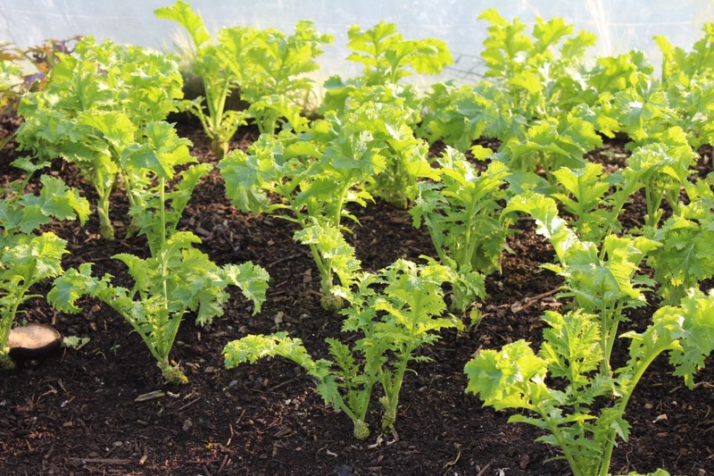 Mustard Red and Green Frills, wild rocket, spinach and chervil at far end
