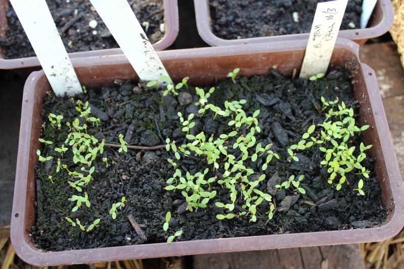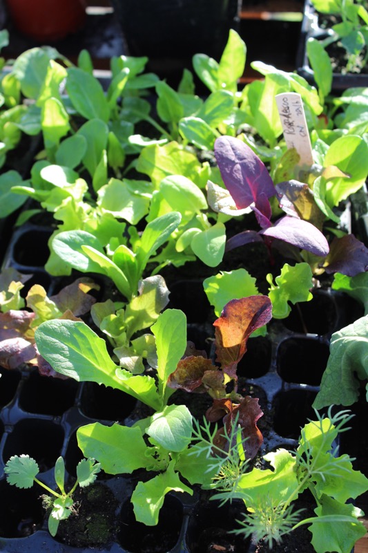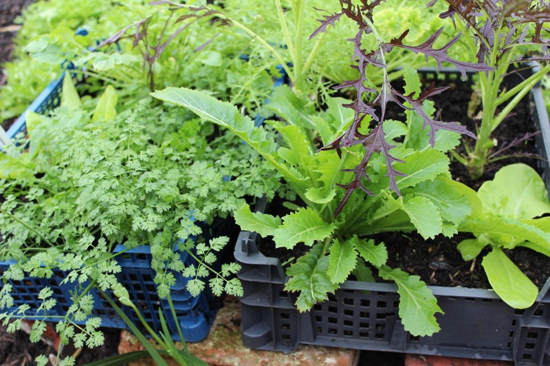 These salads have grown overwinter in mushroom trays filled with compost, in the greenhouse