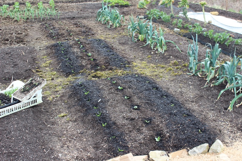 March 24th, the whole bed is sown/planted including onions from seed this end