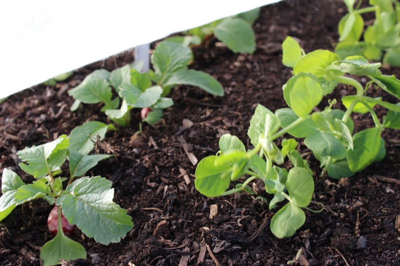 March plantings of peas for shoots and radish – near end planted March 12th, far end March 27th
