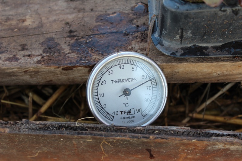 There is plenty to do now and here, I am a little behind after a busy March of talks and courses. Also the hotbed heat has been diminishing through March, so I just boosted it with another four barrowloads of fresh horse manure on top. In three days, the temperature a foot into the heap then rose from 35C to 65C. On the heap’s surface it is 18-25C and I recently cut the bottom off the pallet to get my plants closer to this warmth.