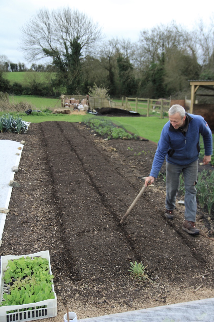 I draw lines in the surface compost, it’s quicker than using strings