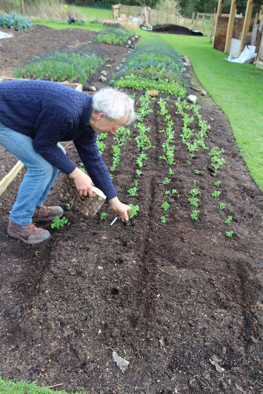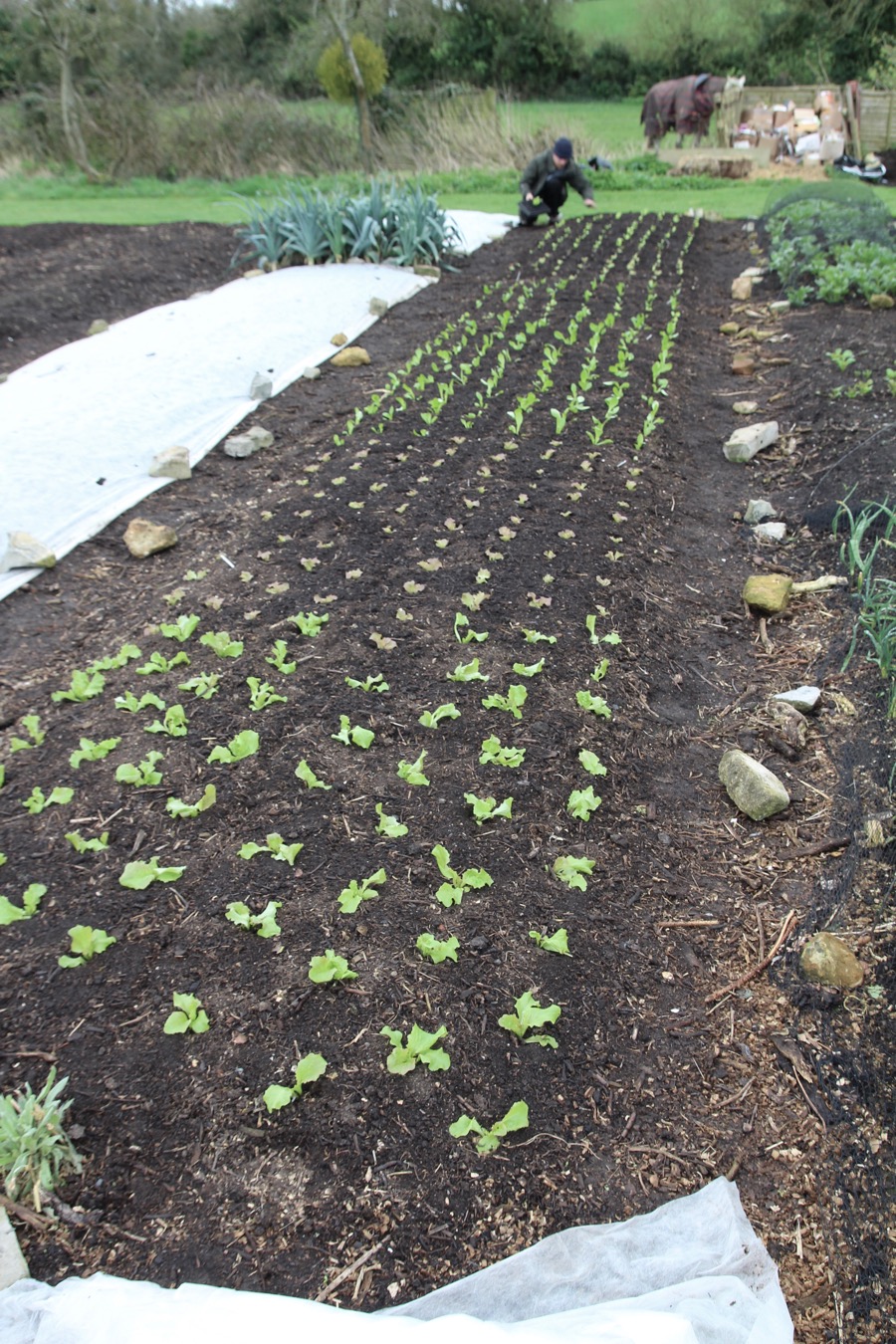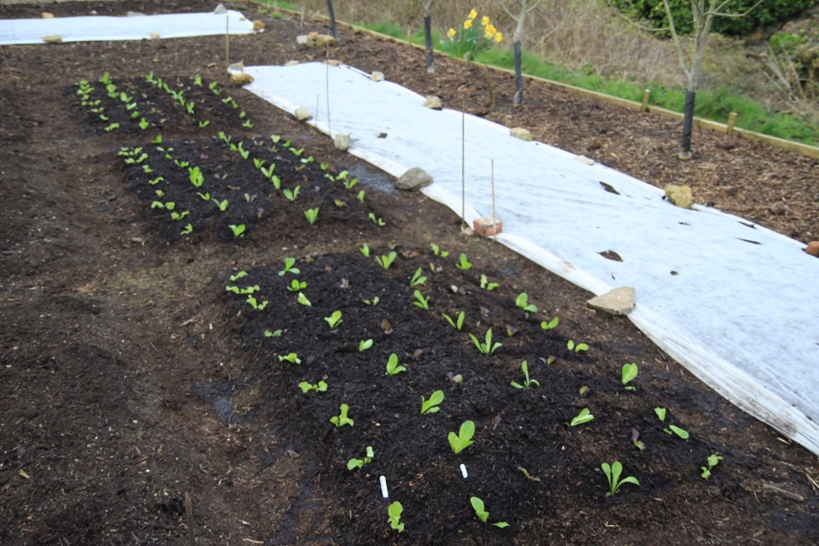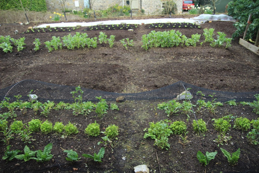 Same bed planted with lettuce , 20th March, then fleeced, Finn at far end