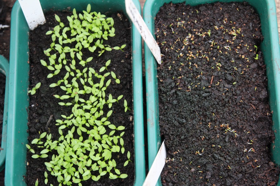 On left is celery, ready to prick out, on right is celeriac sown a week after the celery