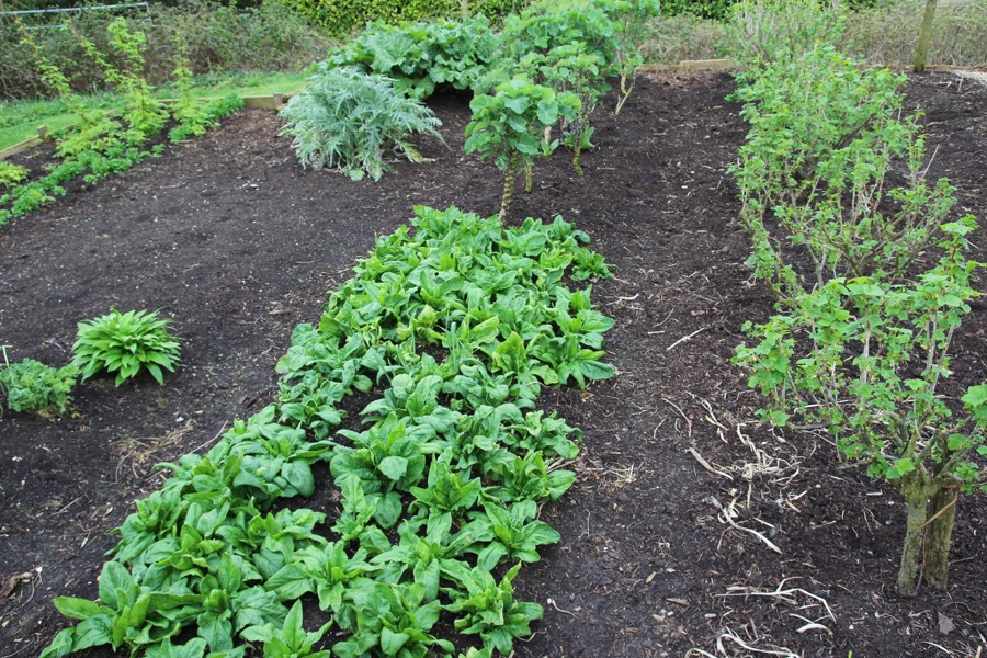 Spinach was sown August and has cropped since October, kale is perennial Taunton Deane, 18 months old, blackcurrants on right