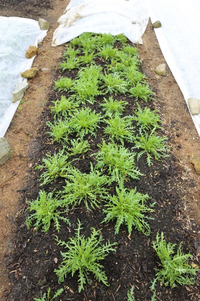 Wild rocket, sown September and overwintered in pots in the greenhouse, planted February outside with fleece over