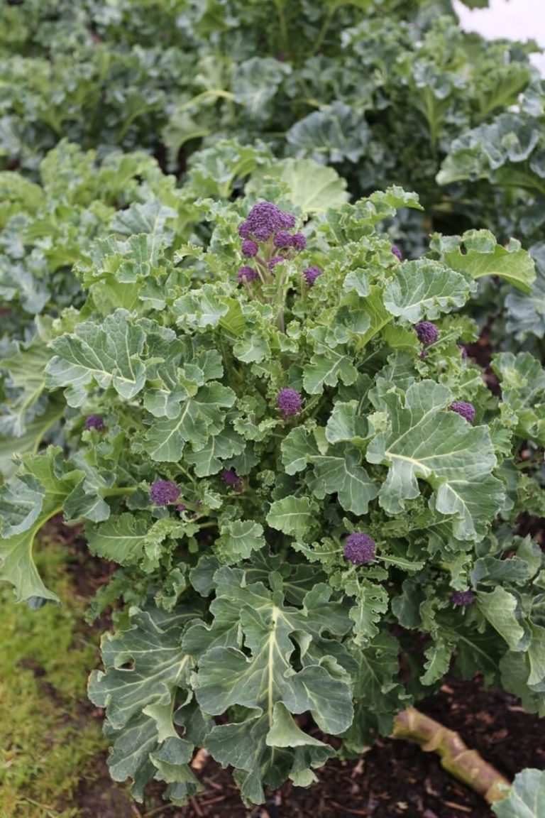 The first shoots of Claret F1 broccoli, sown mid June and planted late July after clearing broad beans