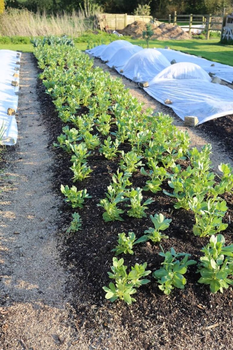 Aquadulce broad beans are finally making strong growth: I sowed them December and planted them in January, they had mesh over until mid March
