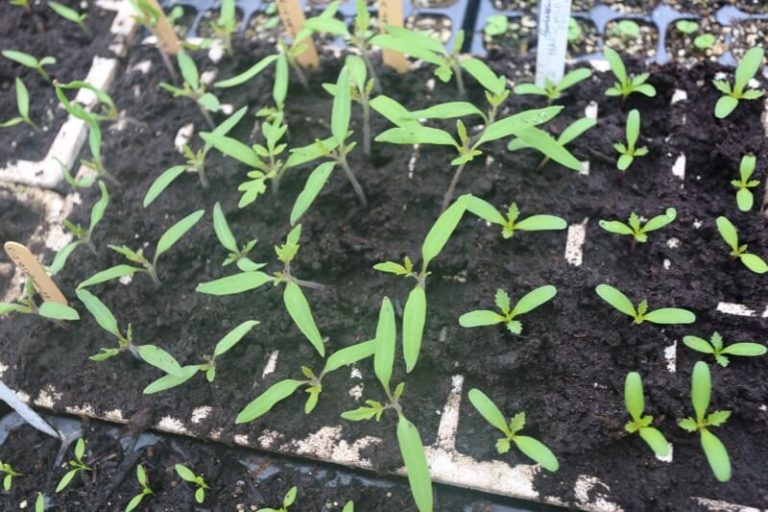 We pricked out these tomatoes and marigolds, now on the hotbed after germinating in the conservatory