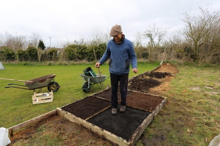 Steph and I created a no dig bed with four parts, each of which has a different compost as the surface layer of 4cm, about 1.5in depth. Underneath is the same base layer of 3in composted cow manure, then 1.5in green waste compost.