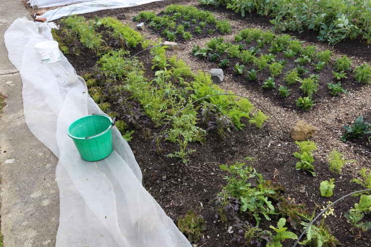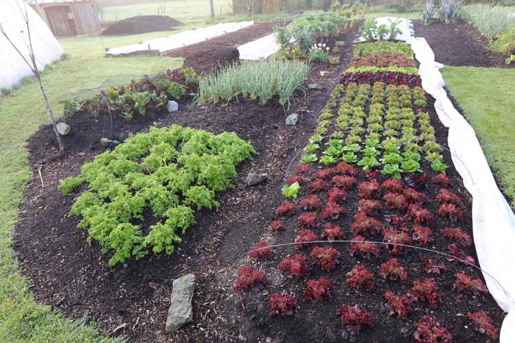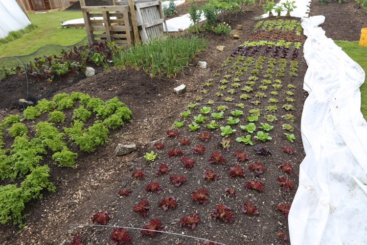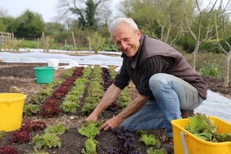 Charles taking a first pick of outerleaves of lettuce planted 4 weeks earlier, fleece over