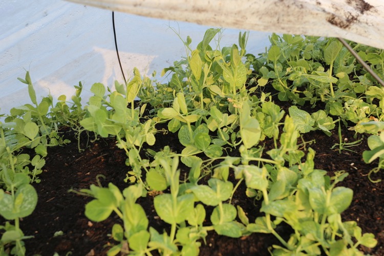 Many new crops are established and I removed fleece today 18th April, as the days warm to 19C/66F, for a while at least. Harvests this week were 380g Claytonia with pretty white flowers, 290g spinach, 240g spring onion, 200g radish, 110g coriander, 60g pea shoots, 50g land cress, 40g chives, and 40g chervil = 1.25kg/2.8lb fresh leafy veg and herbs.