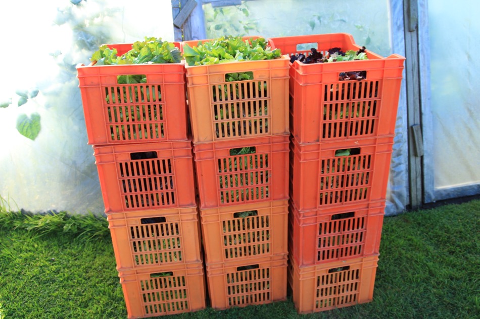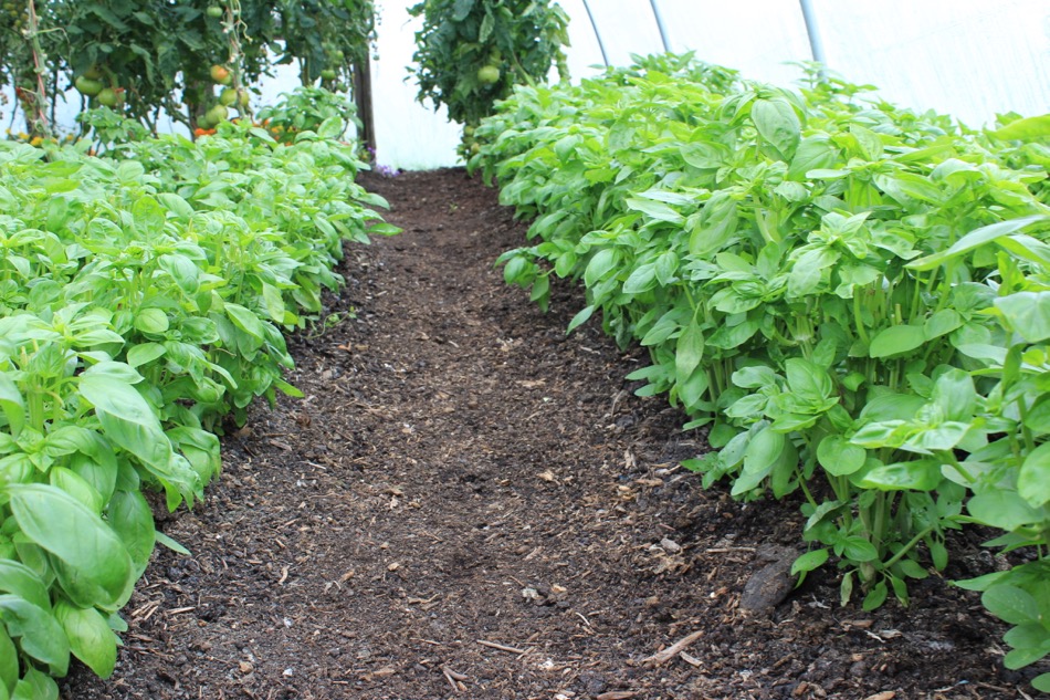 Sweet basil in the tunnel is giving huge harvests, watered twice weekly at soil level