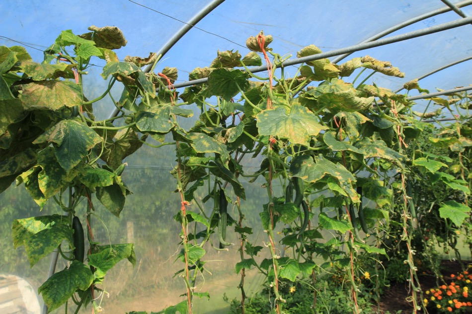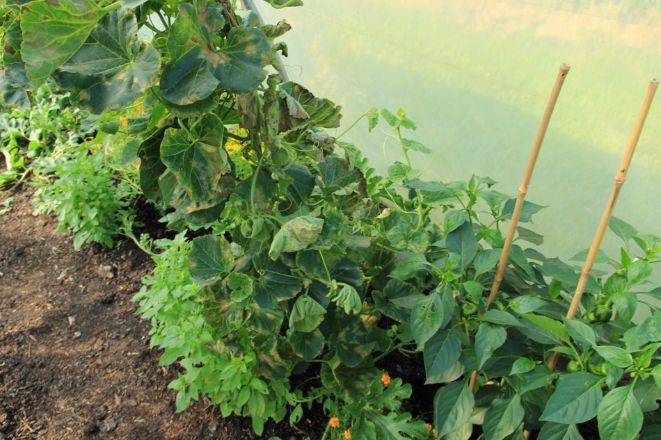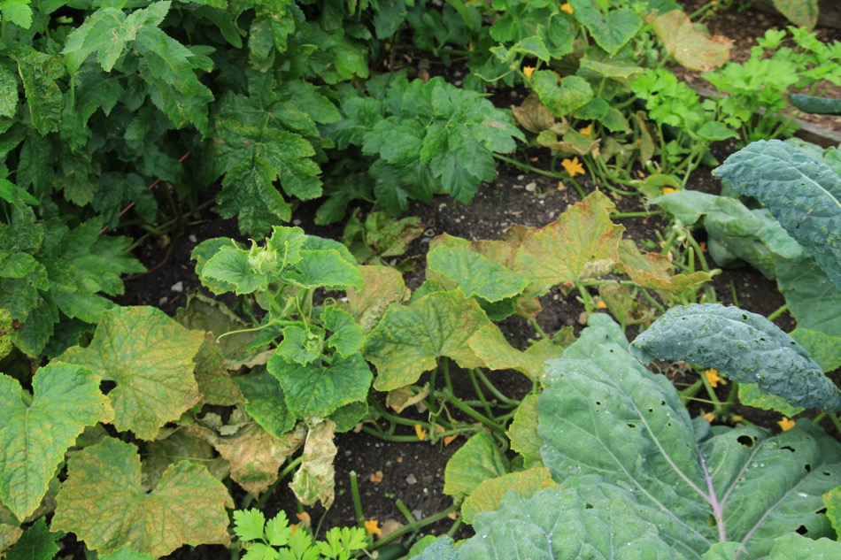 The polytunnel cucumbers were first to succumb and half the plants are now removed, then the polytunnel melons. In the last week, the outdoor cucumbers on the dig/no dig beds are succumbing: first damage was on the dug bed and within a week there was hardly a healthy leaf.