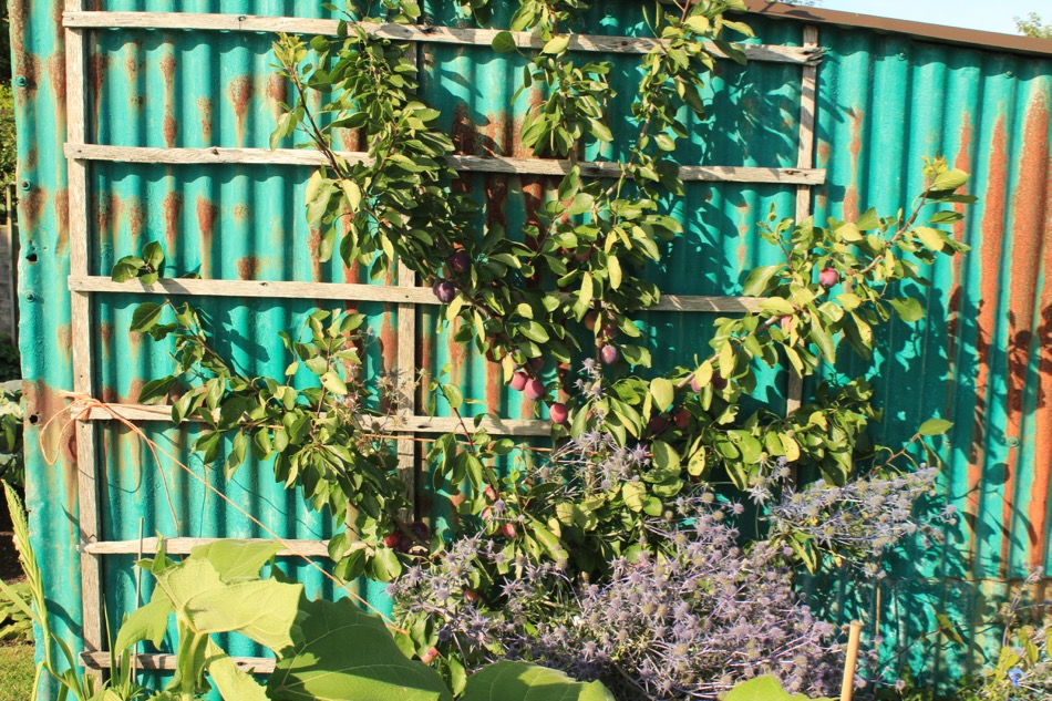 Opal plum in its fourth summer on Pixy rootstock, Eryngium below