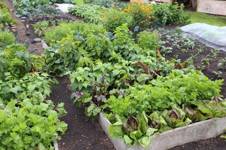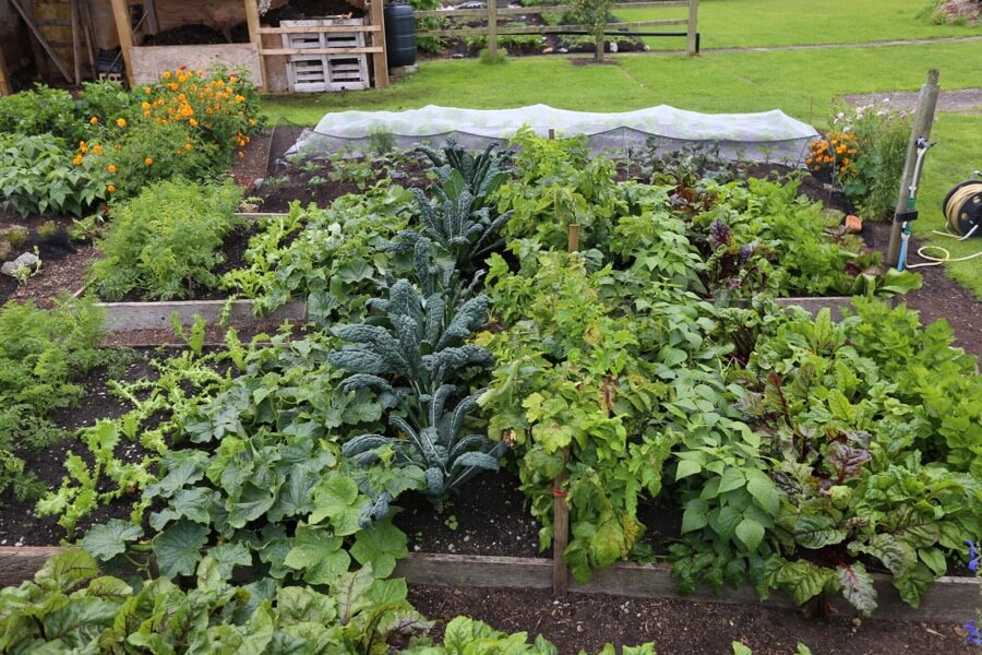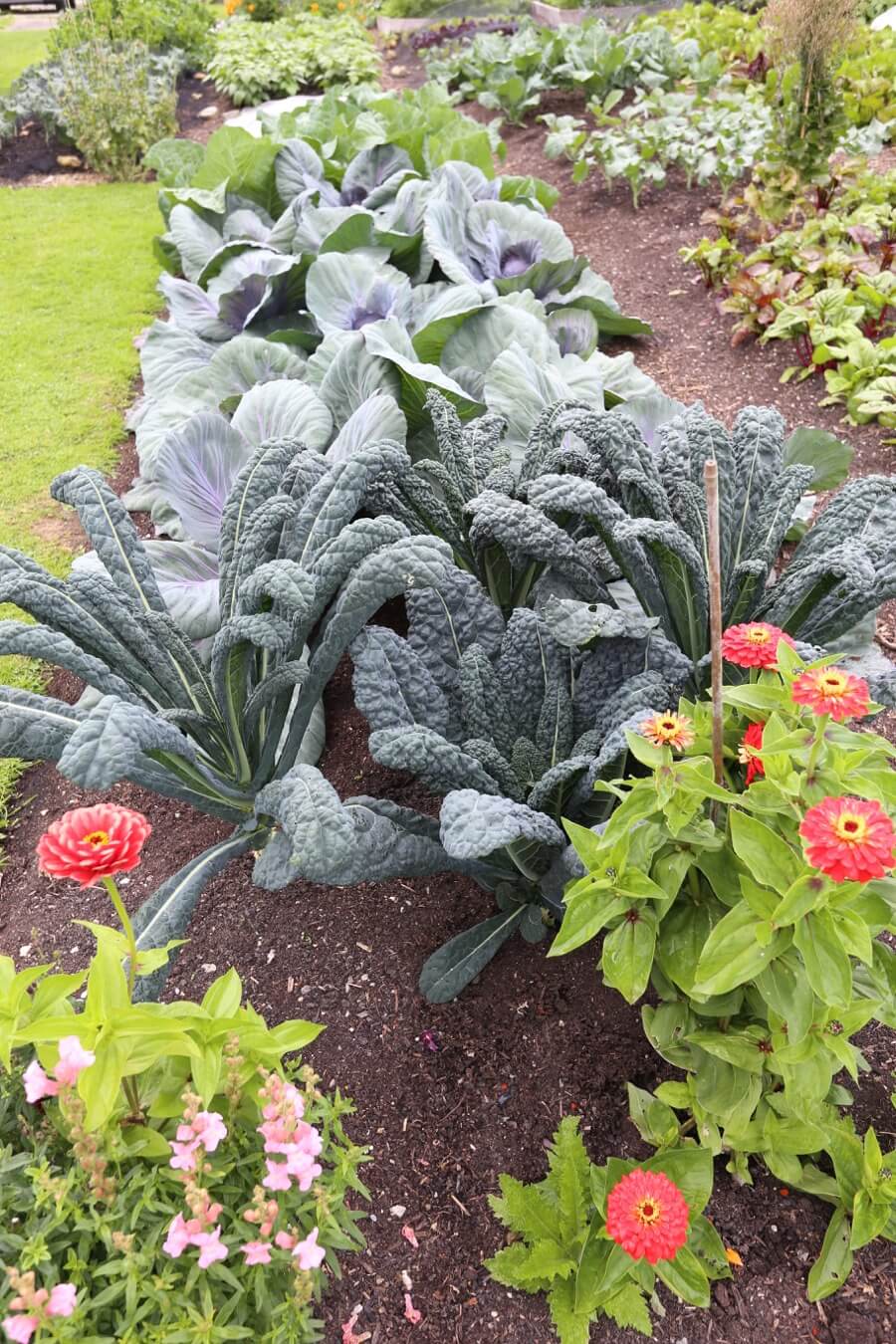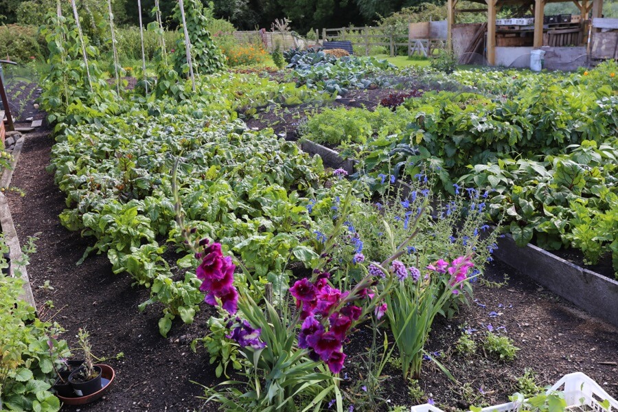 Gladioli offset the green sea of vegetable leaves, with golden beetroot just behind them