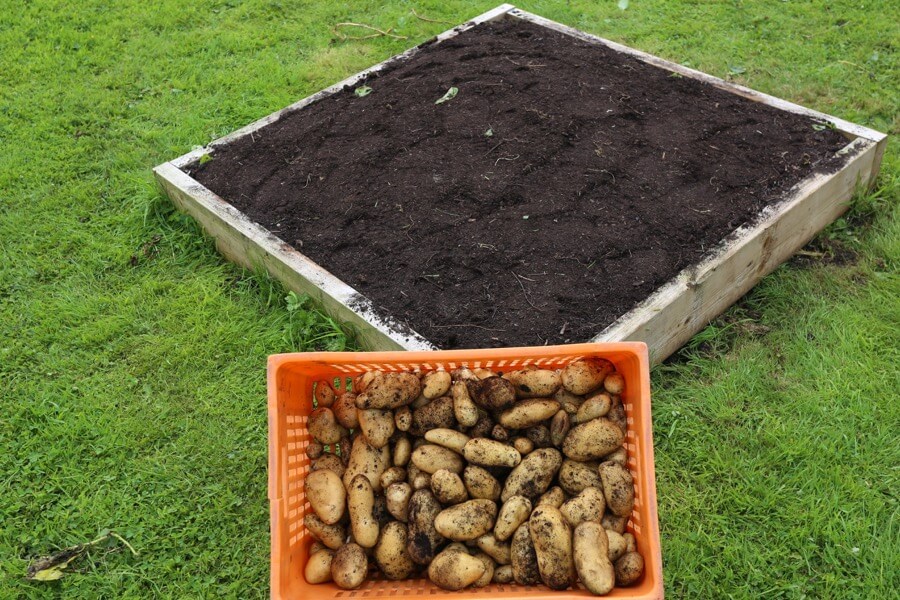 It is exactly one year since the BBC filmed here and I made the little bed for Gardeners World, see the April programme here and the bed making is at 23min. This year the bed has grown Gourmande potatoes, and i was shocked on 13th to discover some blighted tubers, even though the leaves were mostly healthy. I recommend harvesting most potatoes now, except for late maincrops; otherwise you lose more than you gain, to blight and slugs. And after the harvest, you can plant more vegetables.