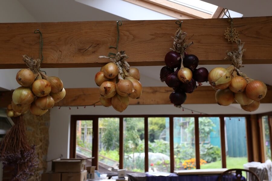 Onions bunched and hanging indoors, grown from seed, will keep until April