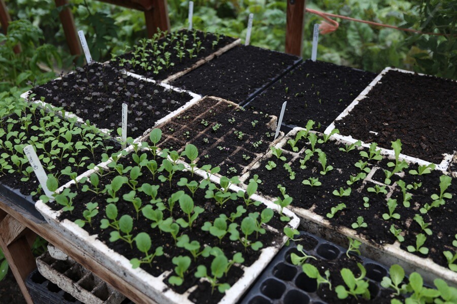 Sowings of early August include oriental leaves, rocket, and spinach just emerging