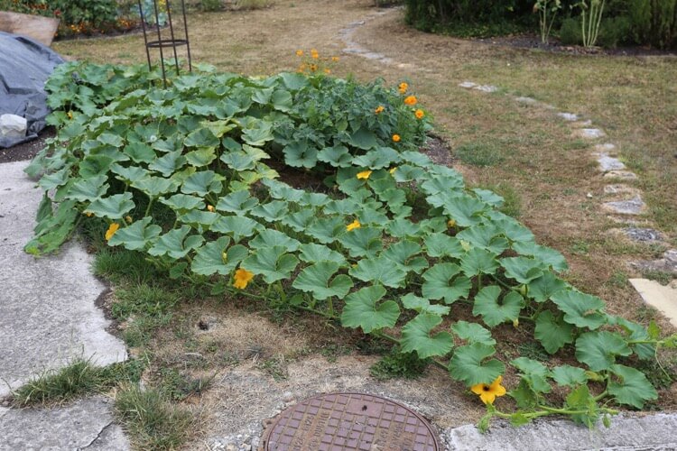 We made a new bed over ground where wood shavings had initially mulched the vigorous weeds. Those shavings are now mulching paths elsewhere while we put compost on the cleaner ground and planted squash.