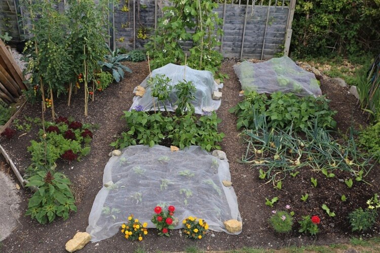 Small garden July 2018, covers removed for photo are over leeks against leek moth & beet plus lettuce leaves against sparrows