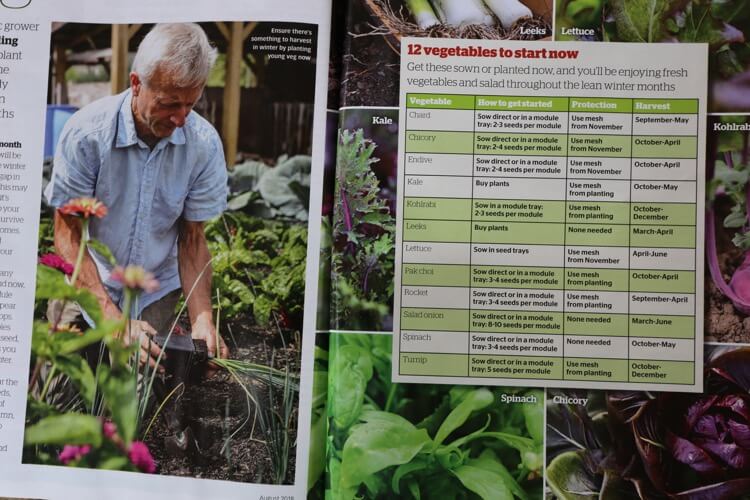 August is fantastic for sowing many veg such as salad rocket, oriental leaves, turnips and spinach. Sow by mid month in order to have vigorous harvests through autumn, sow late month for smaller plants in autumn that may overwinter more strongly.