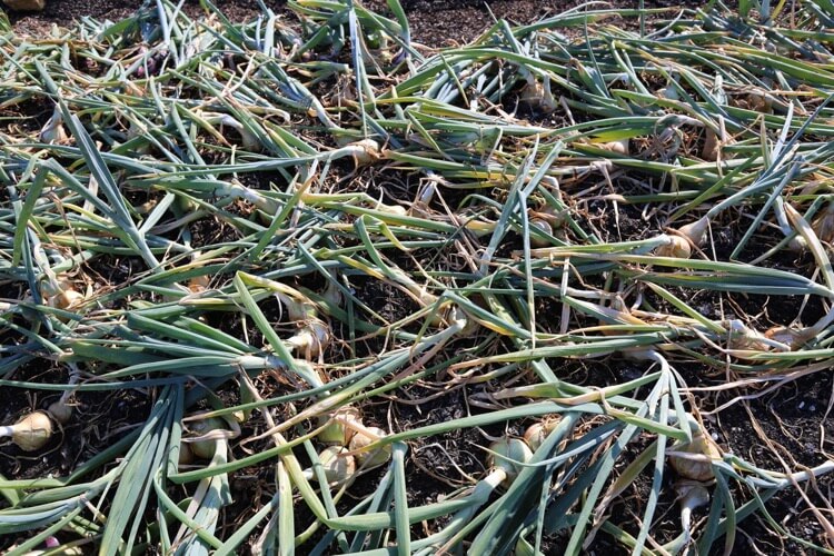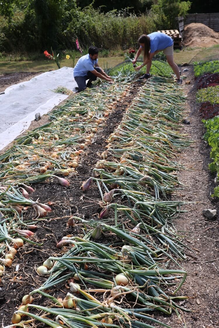 Helpers from California, Andy and Courtney, pulled these onions when already half dry and laid them out beautifully