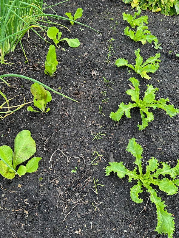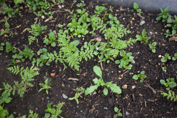 They are the most important story recently, after the incessant rain. During summer, I have never seen so many weeds germinating.Here there must have been a lot of sow thistles seeding in nearby hedges by early July. We are finding their seedlings everywhere.Check for and remove weeds among larger vegetables, where they are less visible. Obviously they're not competing with these larger plants. The issue is that if they drop seeds, that will result in you spending much more time weeding, through the following seasons.
