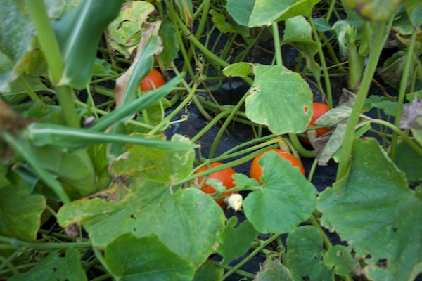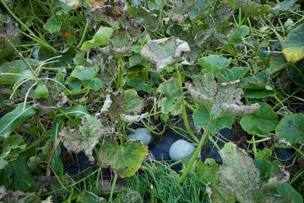 Some of my squash plants have downy mildew, which looks worse than it is, because there are fine squash developing underneath. Also there are still many healthy leaves. It's mainly on Crown Prince which are growing through plastic.At the other end of the same bed as the diseased-leaf photo below, are Kuri squash. You can see the polythene mulch which is covering ground that was weedy pasture six months earlier. I do not put any supports under the squash, they sit on the plastic.