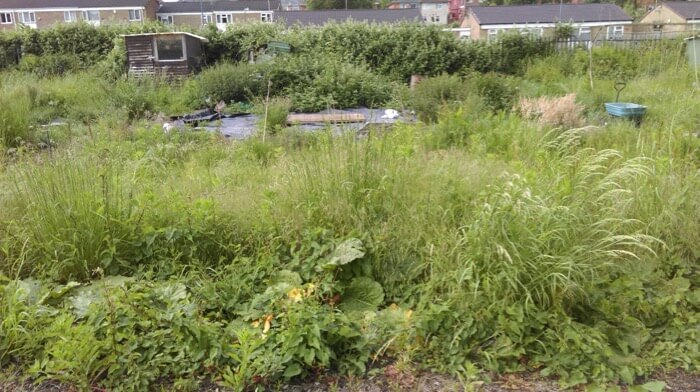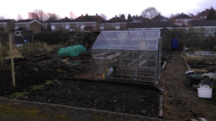 The Birmingham allotment of Susan and Kevin Butlin.During the winter of 2016/17 they cut down the weeds, dug out the roots of brambles that had spread half way over the plot, covered all the area with cardboard, and filled the bed frames with compost bought from various sources.Just 8 months between first and last photos. They are now wondering whether to leave the scaffold planks in place for one year, or to remove them in order to have less habitat for slugs.Plus they have built a roof for the compost bins.In February 2018 they attended a weekend course at Homeacres, after which Kevin wrote