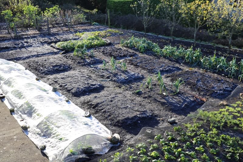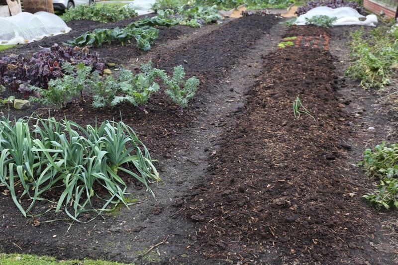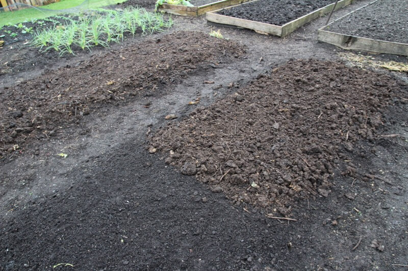 Compost mulches mostly homemade, bed on left has darker green waste on top