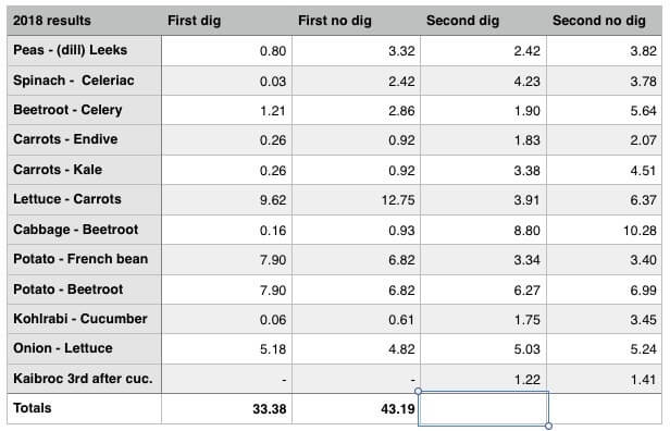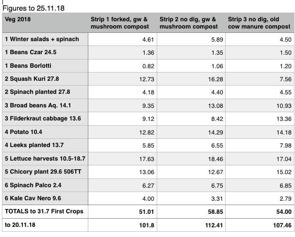 This trial is in it’s fifth year (2018 photos above) and I attach results of 2018 harvests so far. Plus this link takes you to a description of how the trial works, with tables of the harvests of 2014-17.The two main things I notice from working with the different strips, are