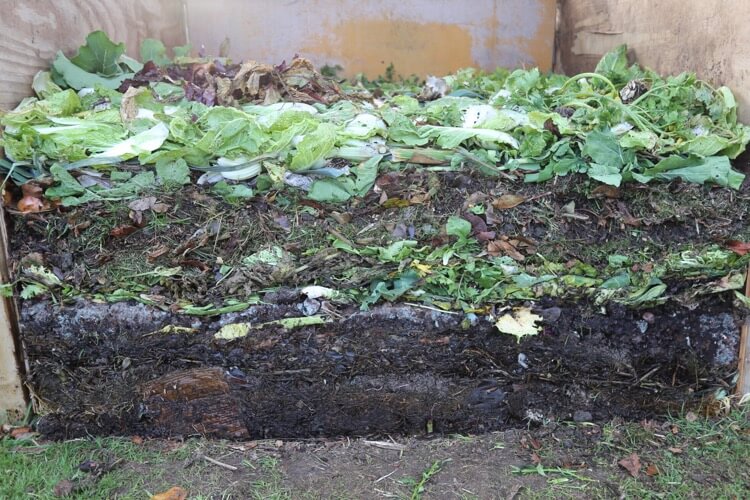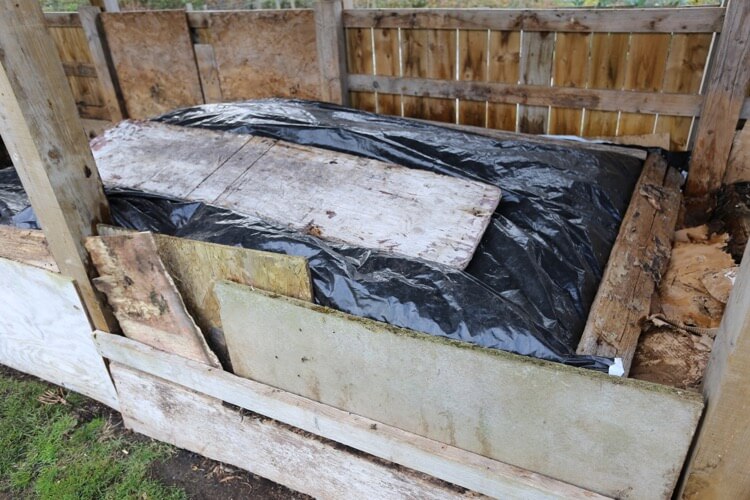 Compost heap after I unscrewed the plywood front to show its profile, 21 days from bottom to top