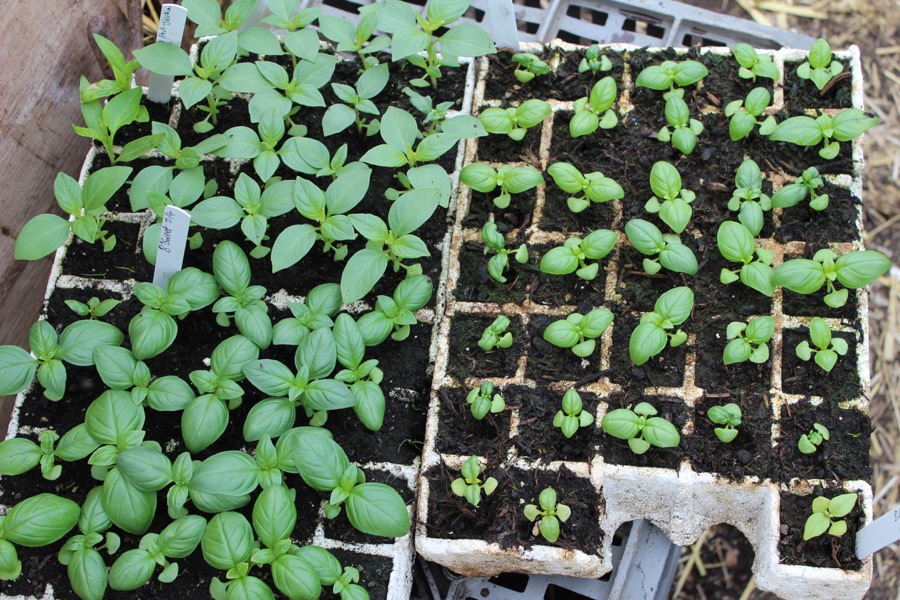 Basil all sown April 2nd 2015, on left was pricked into West Riding compost, on right into Arthur Bowers multipurpose