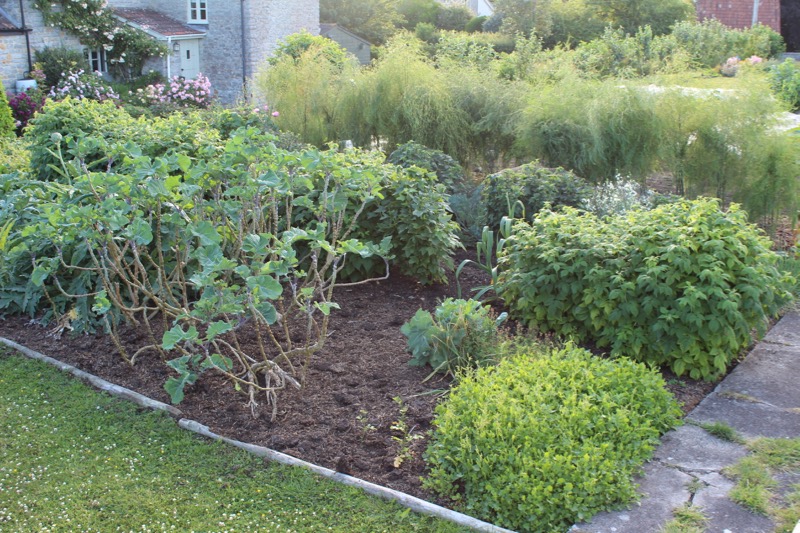 Perennials corner, 3 year old kale are cropping well, Buckler sorrel, currants
