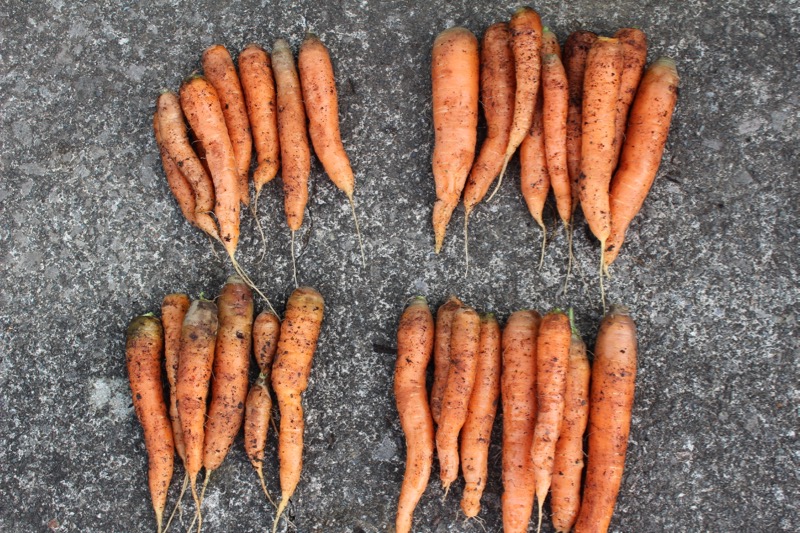 Carrots on right had rockdust on the soil, top row from undug bed, bottom from dug bed