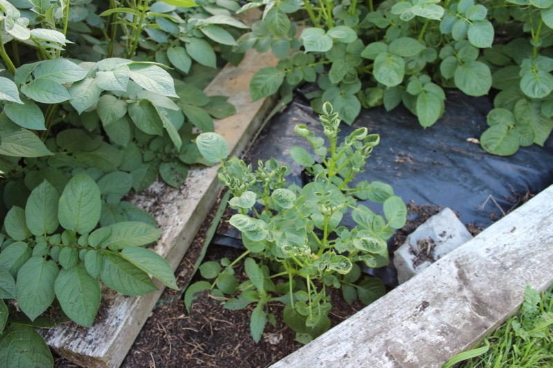 Potato plant massively weakened by aminopyralid weedkiller in some compost: solanums and legumes are worst affected
