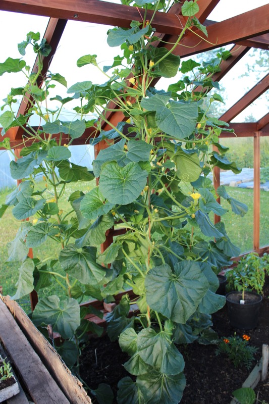Its warmer than the polytunnel and growth has been superb this spring. Sweetheart melons are already over 2m high, so I have pinched out their tops, with baby fruits now growing on sideshoots.
