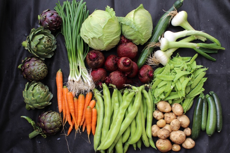 Harvests June 25th, Aquadulce beans, Boltardy beetroot, Golden Acre cabbage, Oregon Sugar Pod peas, Rocket potatoes