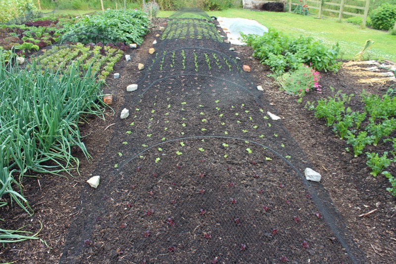 This is s neat way of getting plants established while another crop is finishing. I like to try new things and popped kale between two rows of onions, also the carrots between lettuce look strong, helped by the regular picking of leaves.