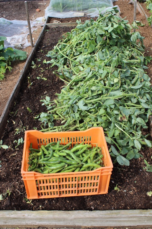 Broad beans - after growing through some determined infestations of blackly (spring sen beans only) - are mostly finishing and as soon as a last harvest is taken, I cut or twist off the top growth, leaving the roots which still have some (not many) nodules of nitrogen. Next to plant in this bed are winter brassicas.