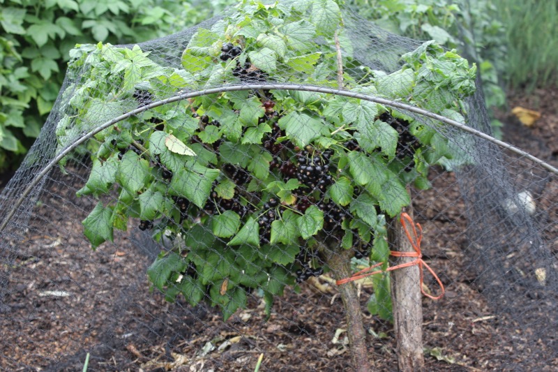 Blackcurrants, many are ripe, temporary net is supported by hoops and the plants