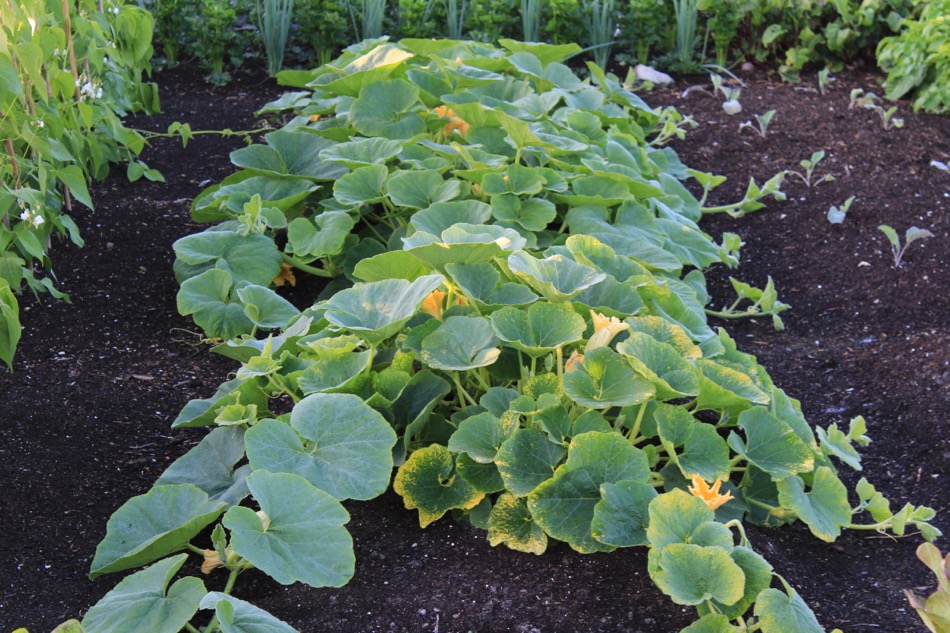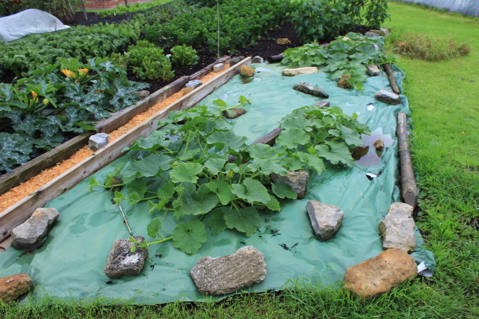 This was weedy pasture in April, there is 3in compost under the polythene, Crown Prince squash planted late April