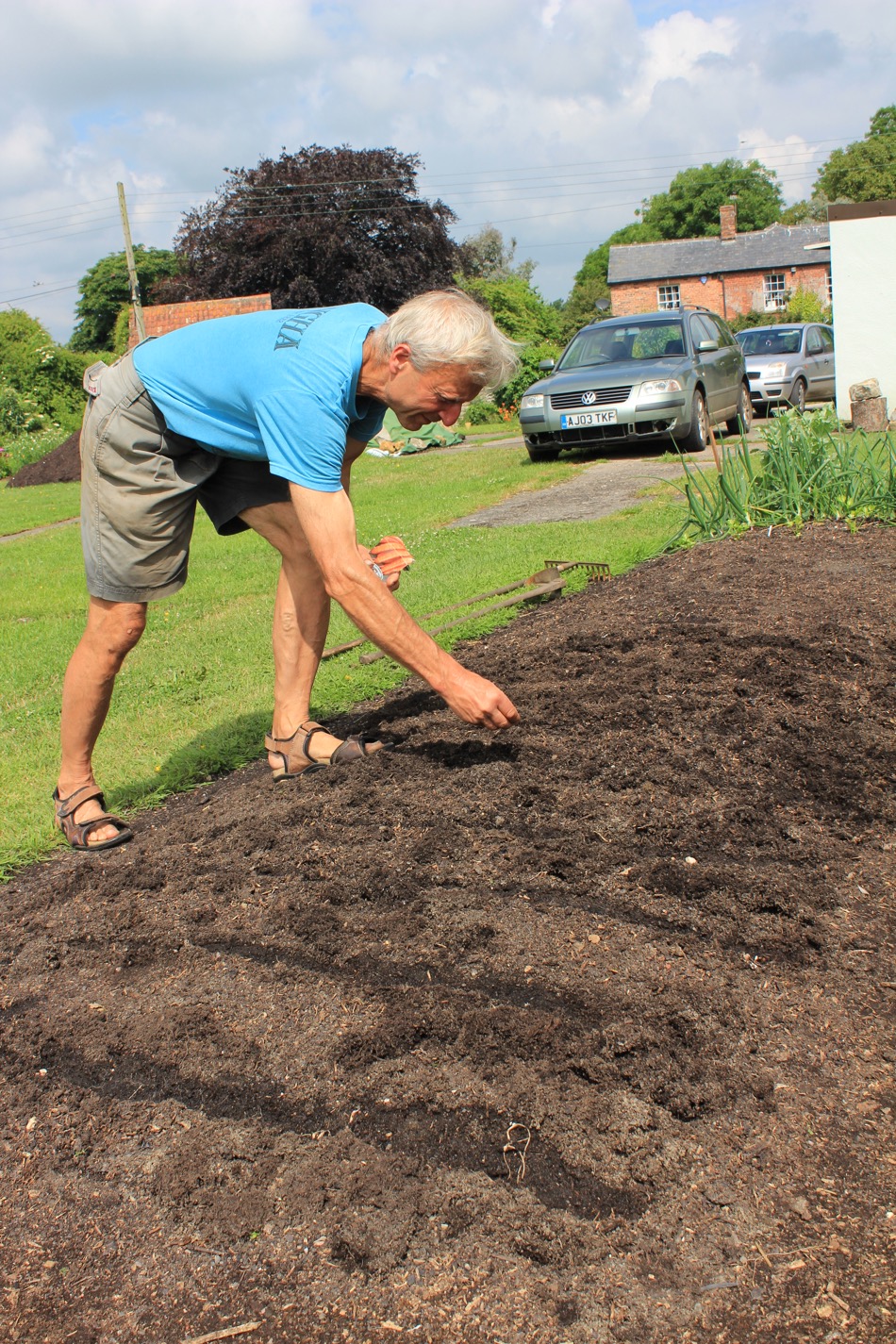 After last spinach harvest, sowing carrots for autumn use, this bed now covered with mesh, against rabbit
